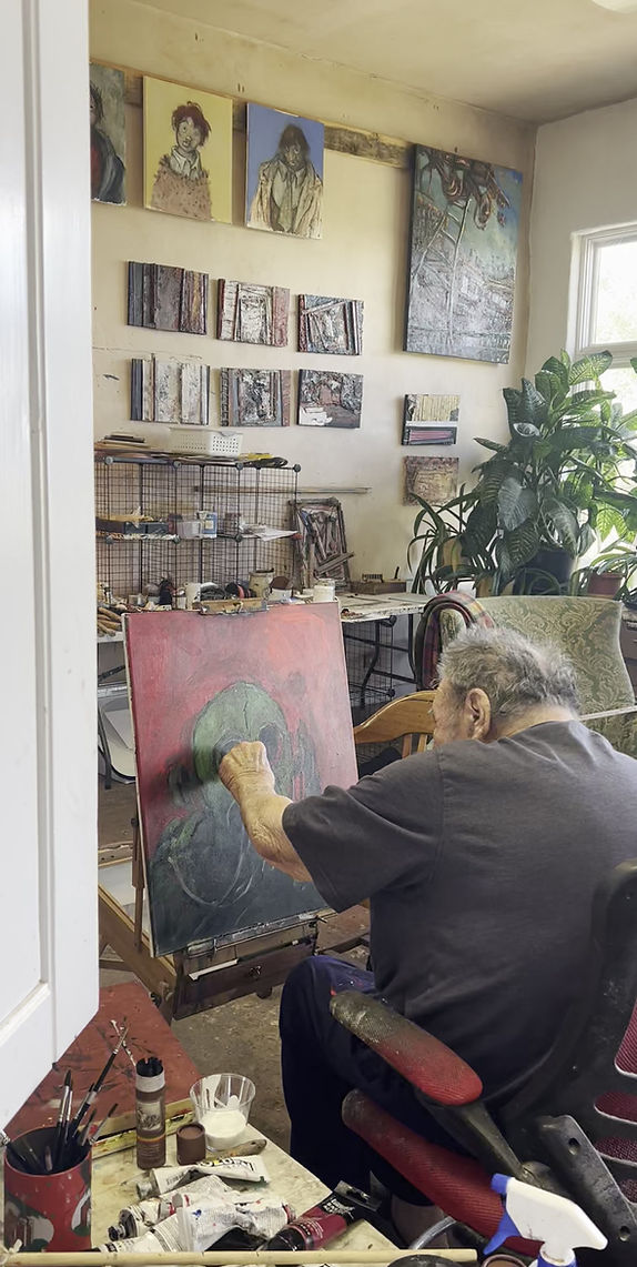 In Soldier Stays, Ralph Bakshi delivers a raw, unsettling figure forged in honest human vulnerability and contradiction. The central character looms beneath a red, multi-lensed helmet that feels both sensitive...and industrial—an otherworldly gas mask fused with the almost ancient alien. Swirling red paint evokes blood or pure life, suggesting either decay or hope, while the blacked-out eyes turn the figure into a full faced emissary of war pleading in its silence.